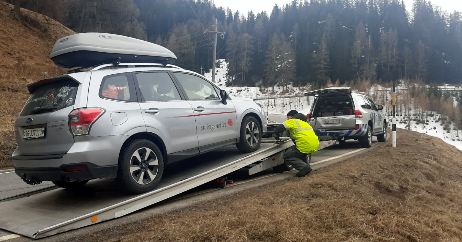 Kaum richtig abgefahren, gab dann das zweite Auto den Geist ganz auf- Motorschaden. Die anschliessenden Telefonate bis zum Eintreffen eines Taxis, das Platz für fünf Personen, Skier und ordentlich Gepäck hatte, dauerte ca. vier Stunden.