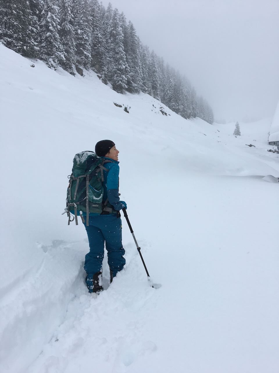 Heidi und ich hatten uns aufgemacht das Rheinwaldhorn als Zweitagestour mit Skiern zu besteigen. Übernachtet wurde in der Länta Hütte. Da es am Samstag sehr neblig war, hatten wir uns für den Zustieg zur Hütte durchs Tal entschieden. Nach ca. 2h hatte ich so krasse Fussschmerzen, dass ich eine Pause machen musste zum Schuhe ausziehen. Dabei hatte ich dann festgestellt, dass ich die Innenschuhe vertauscht hatte, was meine Zehen gar nicht lustig fanden. Heidi fand das so ein bisschen lustig. Danach konnten wir unseren Marsch zur Läntahütte fortsetzen.