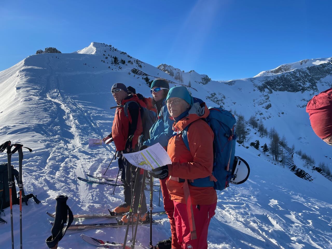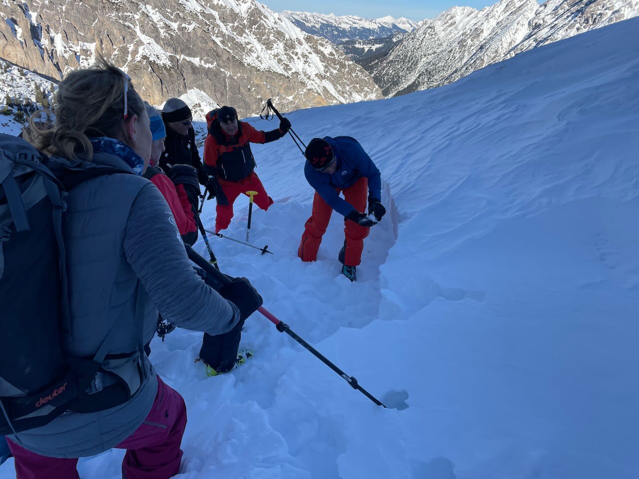 Während der gesamten Tour machten wir regelmäßig Stopps, bei denen uns Norbert vor Ort wichtige Sicherheitsaspekte erläuterte. Wir lernten, die Hanglage neu zu bewerten, den Schneedeckenaufbau zu studieren, die Hangneigung zu messen und die Bedeutung verschiedener Schneeoberflächen zu interpretieren. Norbert teilte sein umfangreiches Wissen mit uns, was unseren Tag nicht nur spannend, sondern auch äußerst lehrreich machte.