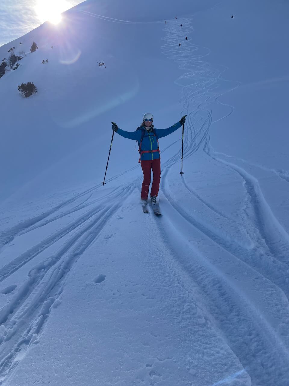 Nachdem wir die Felle verstaut und unsere Helme aufgesetzt hatten, begann die aufregende Abfahrt. Wir durchquerten Pulverschnee und Bruchharsch, während wir die herrliche Berglandschaft genossen. An der Siba Brünna wechselten wir zu einem kurzen Aufstieg für die zweite Abfahrt und zogen ein letztes Mal die Felle auf, bevor es zurück zum Sareiserjoch ging. Die letzte Abfahrt führte uns über die Piste zurück nach Malbun.