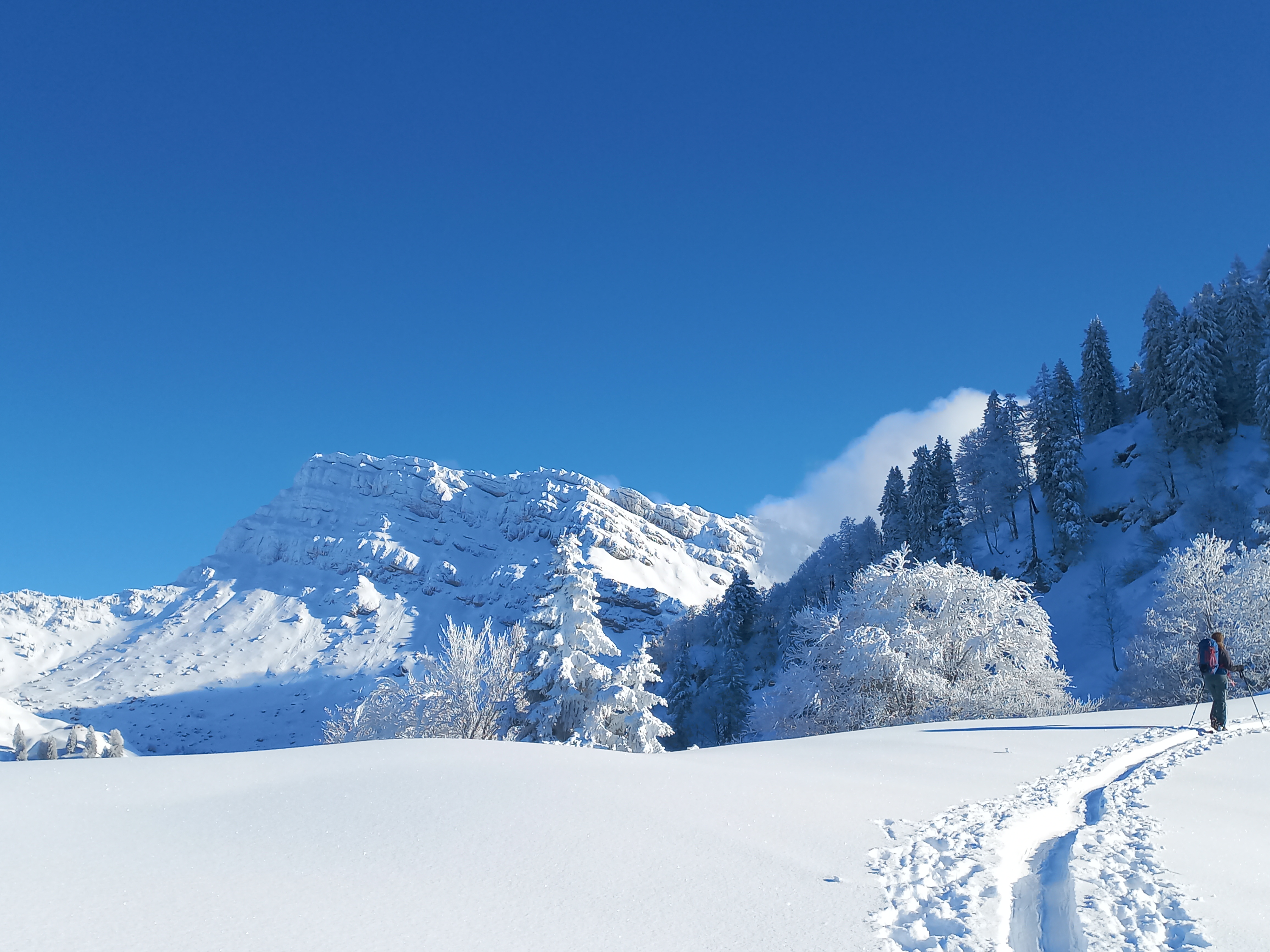 Ein letztes Mal profitierten wir von Silvanos und Tschömys bestens angelegter Aufstiegsspur und bestaunten den Orientierungssinn unserer beiden Guides. Zusätzlich belohnte uns nun auch Petrus mit Sonnenschein für unsere Leistung. Der unglaubliche Anblick der im Nebel auftauchenden, frisch verschneiten Berglandlandschaft versetzte alle in Begeisterung. Das Erreichen der Oberen Bogmen sowie der Weiteraufstieg Richtung Leiterspitz konnte nun bei Traumbedingungen genossen werden.