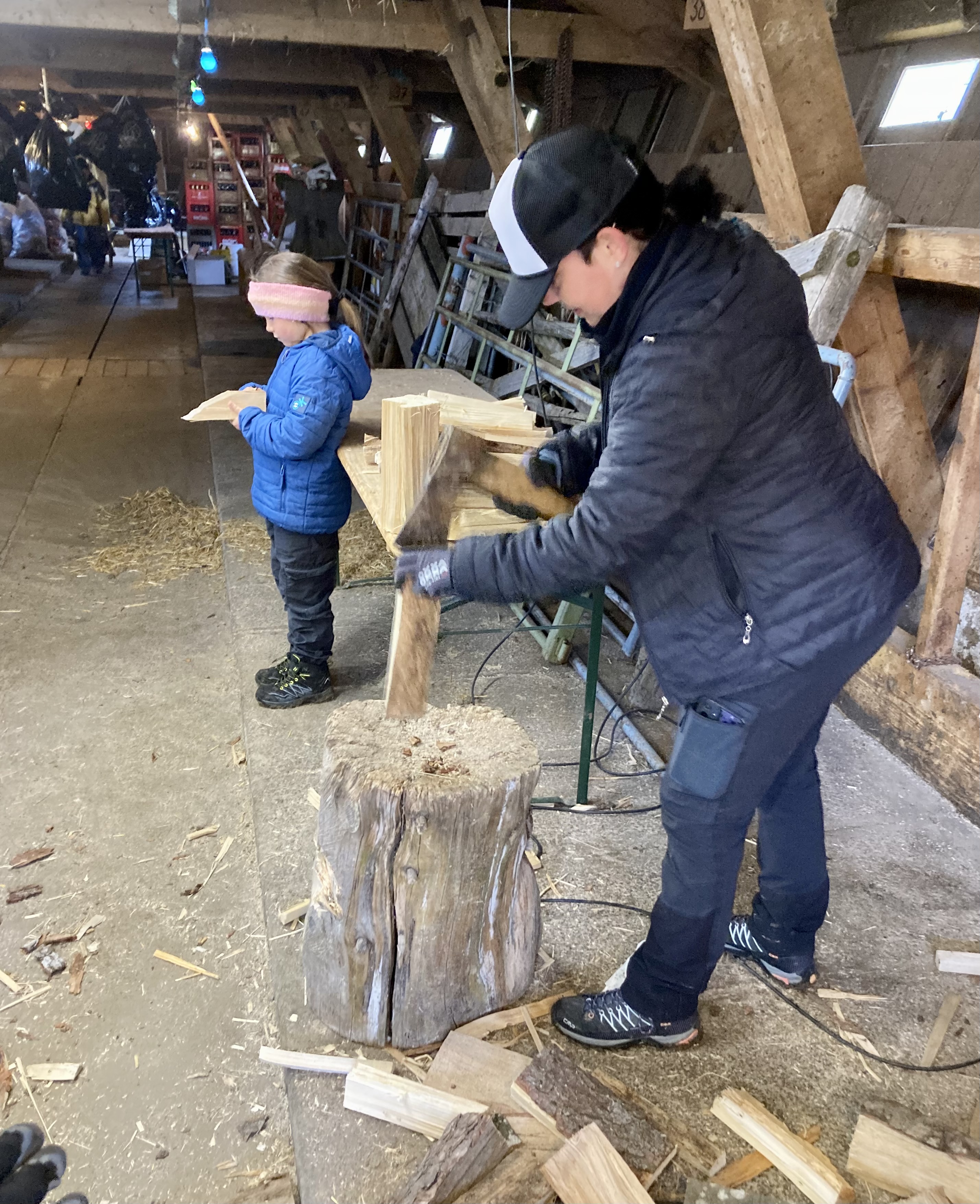 Was sah der Chronist noch? Föns an der Spaltmaschine konnte sich locker eine Kaffeepause leisten, weil sofort ein anderer an der Maschine stand. Sage und schreibe auf drei Schittertötzen wurde kräftig gehackt und die Späne flogen nur so durch den Stall. Vorab war aber der Säger Gonzo im Element, immer noch mit prächtigem Winterbart im Gesicht, und zerkleinerte die grossen langen Schitter auf „Hackbreite“, selbstverständlich mit seinen Assistenten „Holzreicher“ und „Holzwegnehmer“. Sogar eine Dame wagte sich an den Schittertotz. Wir verneigen uns.