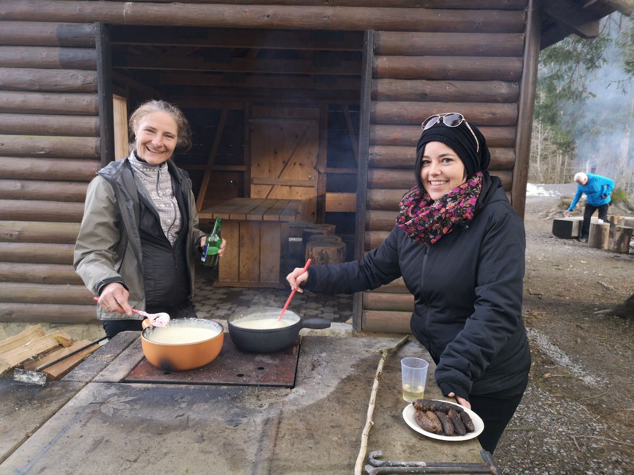 Nach einem ersten Bier in Sargans, ging die Tour weiter nach Nesslau. Denn in der Einladung zur heuteigen Tour stand: auf dem Heimweg laden wir euch ein zu einem feinen Inseli-Wald-Fondue ein. Auf dem Heimweg wurde also fleissig spekuliert, auf was für eine Insel es gehen sollte. Es ging aufs Inseli beim Johanneum in Nesslau. Der Ort ist wirklich auf einer kleinen Insel mitten in der Thur, den man über eine Brücke erreicht. Auf der kleinen Insel befindet sich eine kleine Kapelle und zwei kleine Hütten mit einer grossen Feuerstelle. Und bei dieser Feuerstelle begrüsste uns Fisch mit seiner Familie. Zusammen mit seiner kleinen Tochter hat er fleissig Feuer gemacht und das Fondue vorbereitet. Bei einem Glas Weisswein und einem feinen Fondue mit Alphüttenfeeling am grossen Feuer, beendeten wir einen weiteren Tourentag vom Skiclub Bütschwil.